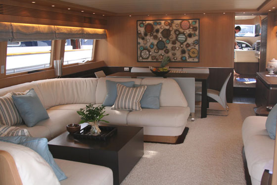 These yachts did not use the past two years to do minor repair work. I’m talking about serious refits and complete interior overhauls. The owner of Asha spent €640,000 to add a sundeck Jacuzzi, extend the yacht’s swim platform, install zero-speed stabilizers, and freshen the interior. The owner of Anna J dropped €1.5 million to add a hydraulic swim platform, increase crew capacity, install teak on a non-skid sundeck, and completely renovate the interior including woodwork and bulkhead fabrics. I couldn’t get a price point on the refit of 360°, but it had to be well into six or seven figures since it included installation of zero-speed stabilizers, a cabin reconfiguration, an all-new interior by a Los Angeles designer, a brand-new audiovisual system, and new marble in all the cabins. And Idol, well, her owner’s €1.5 million was spent on recreating her interior as a contemporary showpiece that is being buzzed about on the docks as absolutely stunning.
