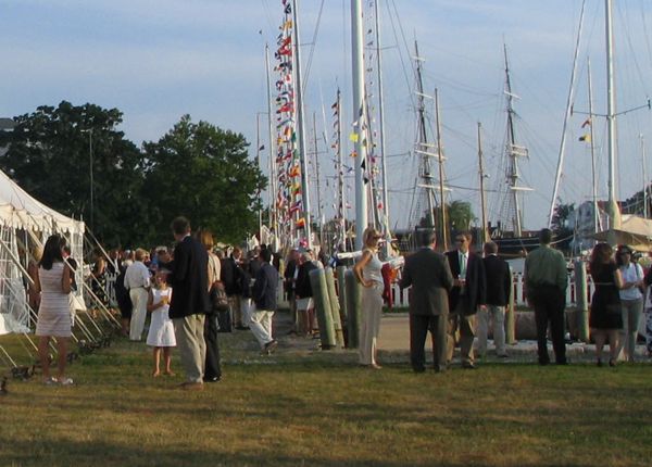 The celebration continued on Friday, July 9, with the arrival of seventy of Sparkman & Stephens finest designs at Mystic Seaport. That evening S&S held a Welcoming Party for the arriving yacht owners, their crews, and other friends of S&S. Originally only 100 people were expected for the cocktail party at the Mystic Seaport's Member's Garden, but when 350 people RSVP'd, the party had to be moved to the River Room and Patio at the Seamen's Inne, adjacent to the Seaport. Yachting Magazine, Mount Gay Rum, and Sparkman & Stephens sponsored the Welcoming Party.