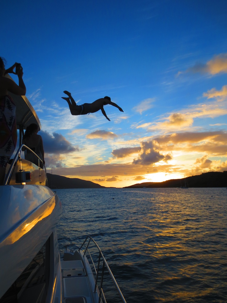 We sail to Hodges Creek to make the switch to our new boat, the MarineMax 484 power catamaran. The switch takes a while, but we finally leave the docks in time to get to Virgin Gorda in the late afternoon. Except for a quick dip at sunset, water activities will wait for tomorrow.