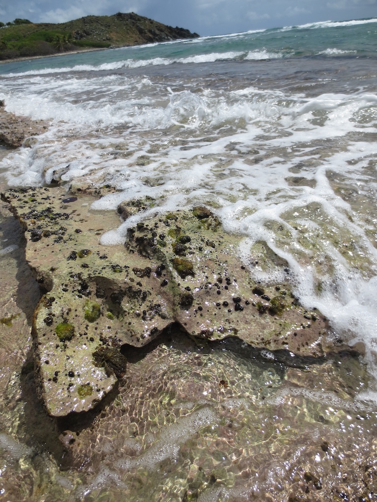 After breakfast, we head to Great Camanoe Island and drop our anchor in beautiful Lee Bay on the west side. We are the lone boat, which seals the deal. I snorkel twice in the afternoon—once alone, then again with John late in the day. We enjoy the depth of the water by the cliffs, plus more of the same fish and spectacular purple fan coral.