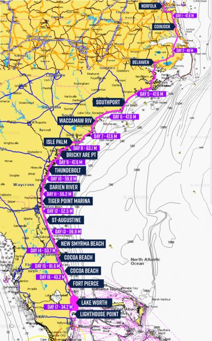 The journey began on Sunday, July 23rd, departing from the Dismal Swamp in Norfolk, VA, and ending in Miami. The crew has stated that they are going to try and maintain a cruising speed of approximately 10 mph, taking weather and water conditions into consideration during the voyage. Vincent said, however, that the first couple of days were more treacherous than expected and they’ve been averaging about 5-6 mph thus far.