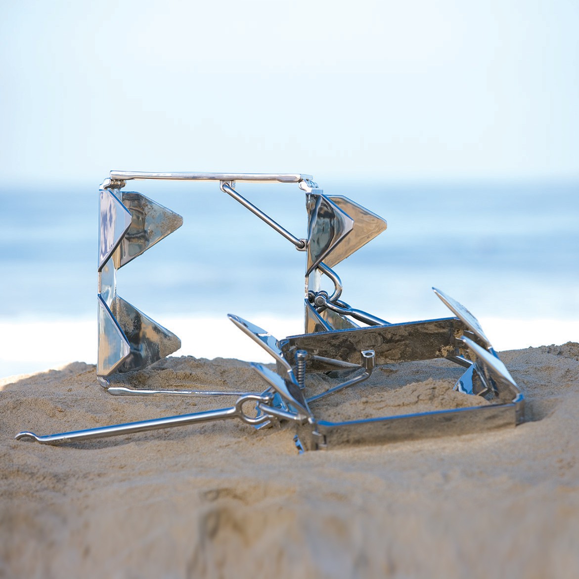 Other than its unusual looks, it’s hard to say why this one hasn’t caught on. It’s a square anchor which has eight flukes, that dig in no matter how the anchor lands. It holds with substantially less scope than usual, and works in all different bottom types. Plus, it’s hinged so you can fold it flat for easy stowage.