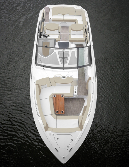 The Cruisers 328 Bow Rider is a perfect example of how bigger is better, especially when it comes to bow riders. It should fit the needs of a lot of buyers looking for more of, well, everything. One thing it offers that few of its type can match is a mid-cabin. Tucked behind a CNC-machined aluminum door and a horizontal hatch with a skylight, the 328’s mid-cabin comes well equipped with an L-shape lounge, a flat-screen TV and a head compartment. (You can get a glimpse of it in our Sneek Peek at the Cruisers Yachts 328 Bowrider video). It’s all tastefully decorated with soft-touch vinyl, woodgrain cabinetry, and a polished stainless-steel and wood staircase. It’s a spectacular touch and something that highlights the strength of large runabout designs.