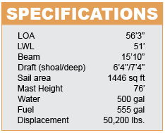 Everything from the oversized Antal winches to the beefy 12” cleats says the Hylas 56 is ready for offshore work. The triple-spreader rig includes a 76’ Selden mast, and forward and aft lowers with individual chainplates add extra strength. A suit of Doyle sails includes a choice of mainsail configurations including in-mast furling, and a 135% genoa that brings the total sail area to 1,821 square feet. That might sound a bit intimidating, but all lines are led aft and the electric winches mean that shorthanded or singlehanded sailing is not a problem.