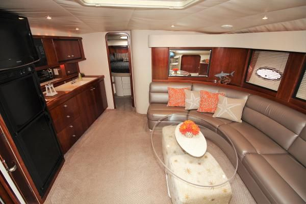 The cockpit has two areas: an aft lounge and a forward command bridge, and both are sumptuously upholstered. Wrap around seating with a cocktail table is aft to port, and a wet bar with hidden sink is to starboard. The double helm seat is electrically adjustable and there is a companion bench to port.