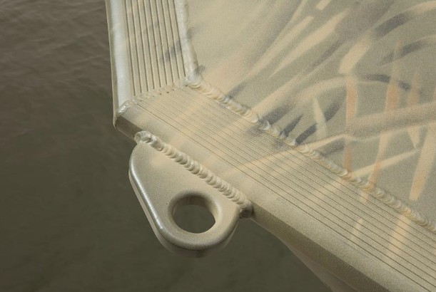 The second feature of note is the Sportsman’s hull thickness. Many aluminum boats under 16’ or 18’ have 0.08” thick aluminum, but this hull is 0.1” thick. Look on the boat’s fore and aft corners, and you’ll notice that welded to the hull, there are eyes. These allow you to stake the boat in place, once you've pick out your hunting spot. Other hunting features include a gunwale track mounting system for a blind, tool-holder, and other gadgets, plus a locking gun box.