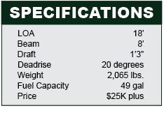 Rumors of this well-known brand’s demise have been greatly exaggerated, as Wellcraft is alive and well and building fishing boats out of Cadillac, Michigan. The 180 Fisherman is an economical 18-footer, with a deeper V and more transom deadrise (20 degrees) than most boats in its size range, and a more basic layout. With the 150-hp Evinrude E-TEC it can top the 40-mph mark, and should take a while to run through the 49-gallon fuel tank.